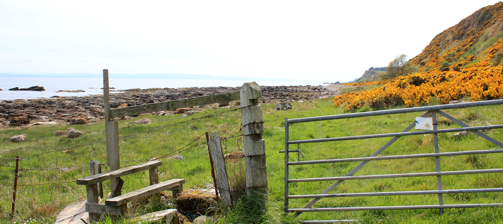 … until I reach the end of the road. Through a gate, and the Core Path to Balintore begins. 5 miles. Just a short walk today, because I need time to travel to the new campsite and get set up before it grows too late. This path looks lovely.
