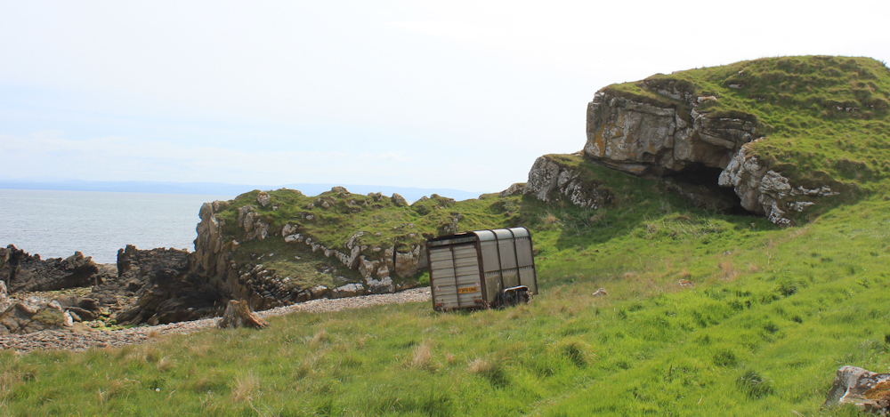 The old door has a horseshoe hanging on it. Might just be for luck, or might be something to do with a nearby horsebox parked in front of a low cave in the cliffs. No sign of any horses.
